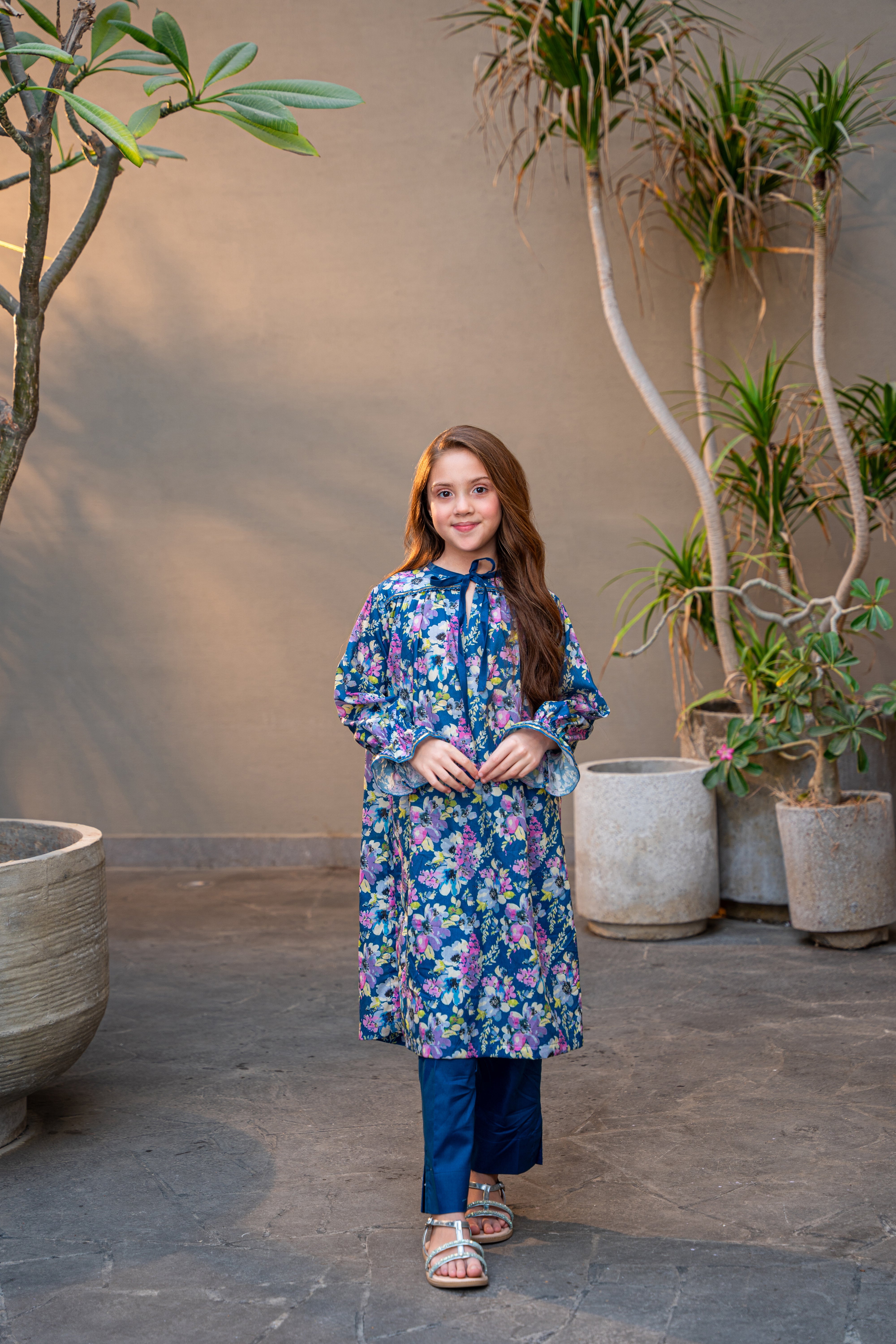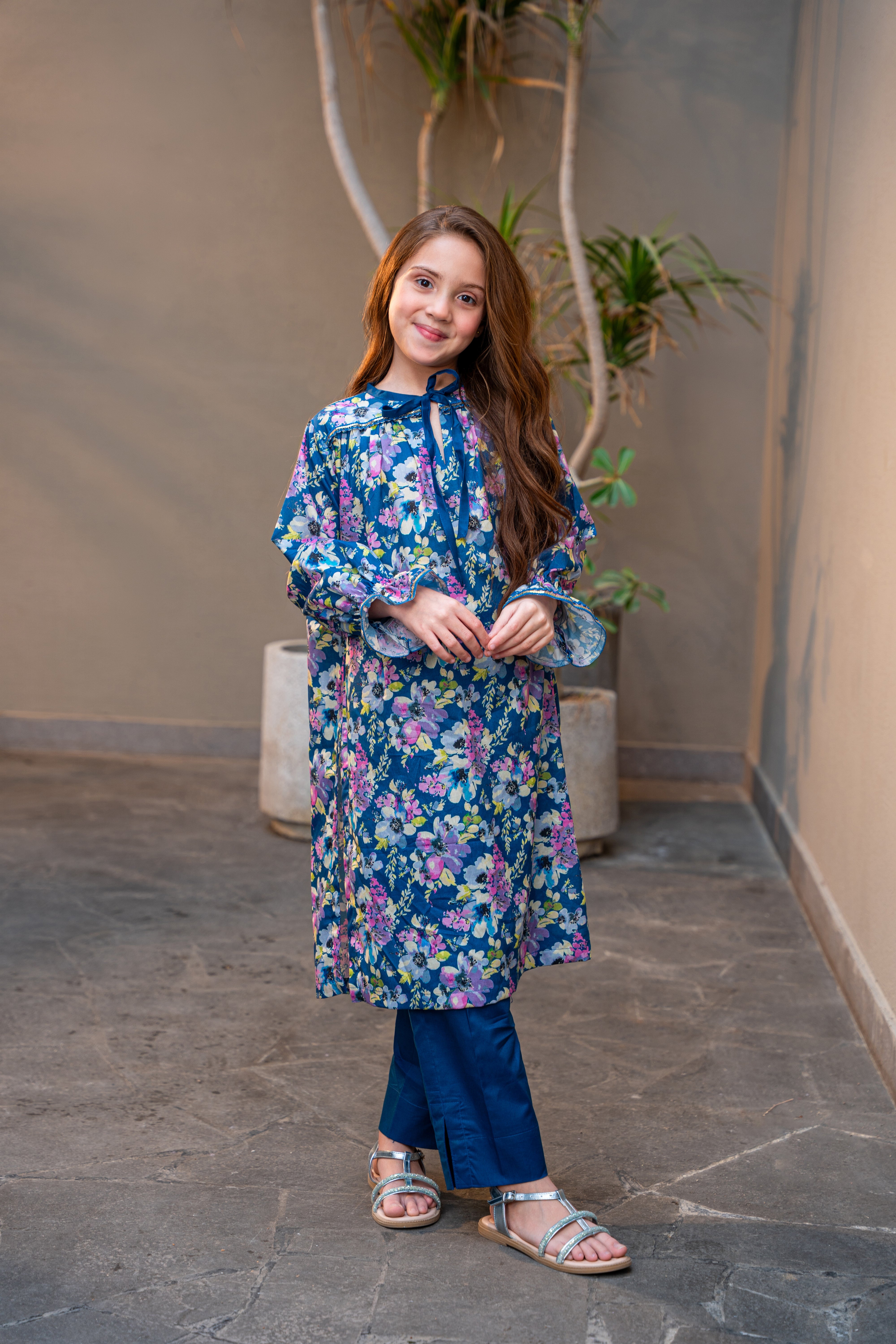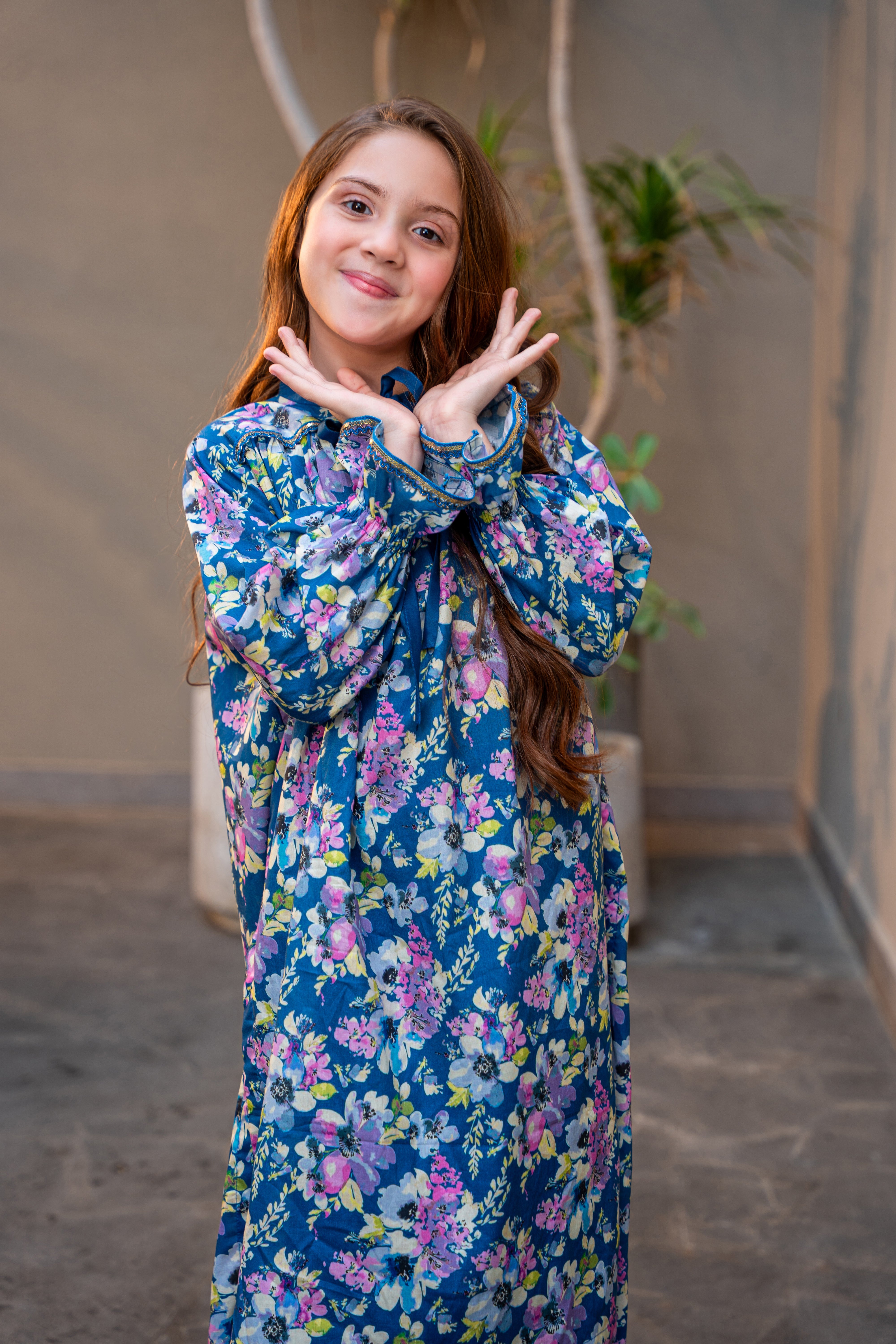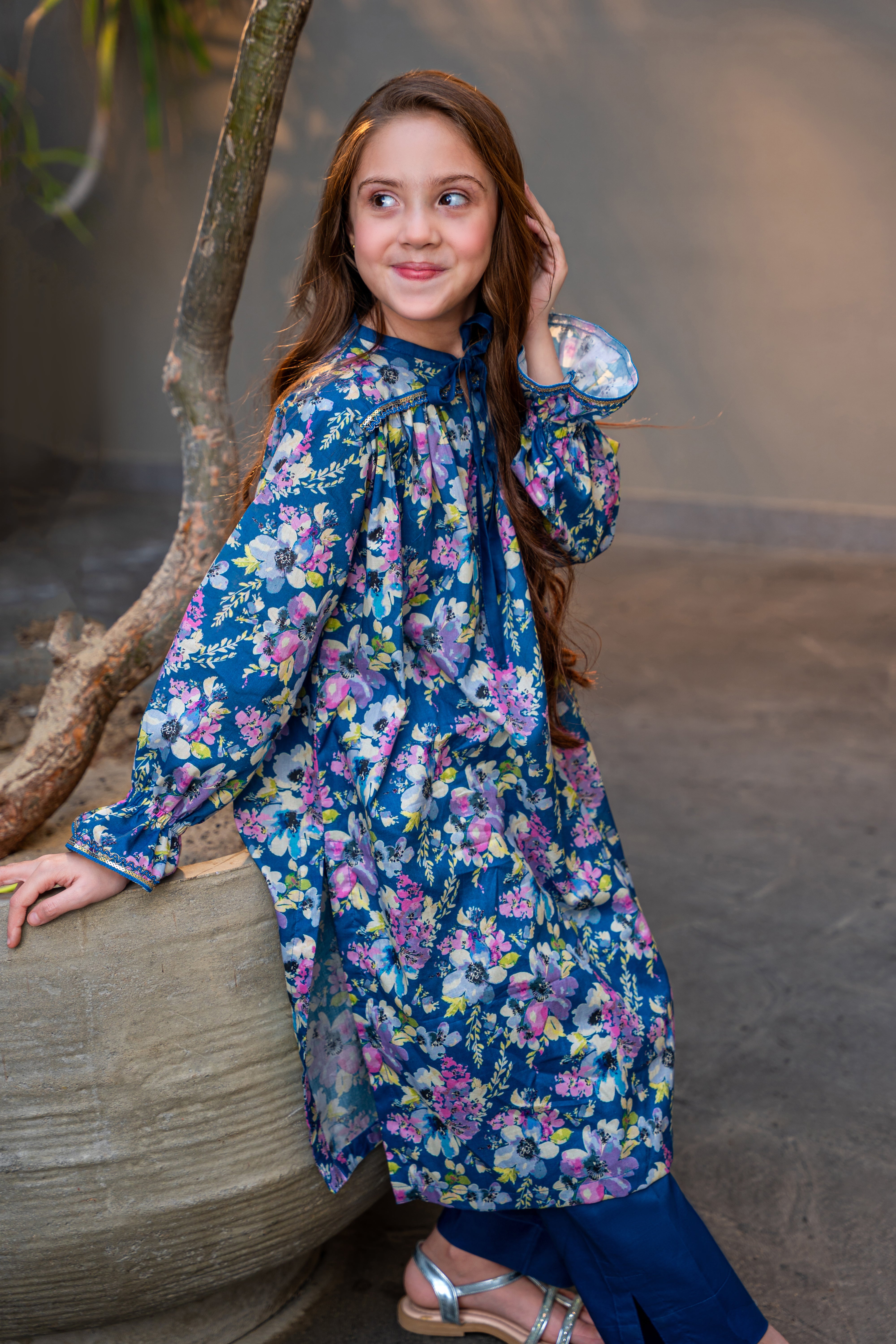 THE FLORAL PRINTED SHIRT OFFERS A COMFORTABLE YOKE SILHOUTTE WITH SUBTLE LACE DETAILING ON NECK AND SLEEVES WITH GEATHERS.